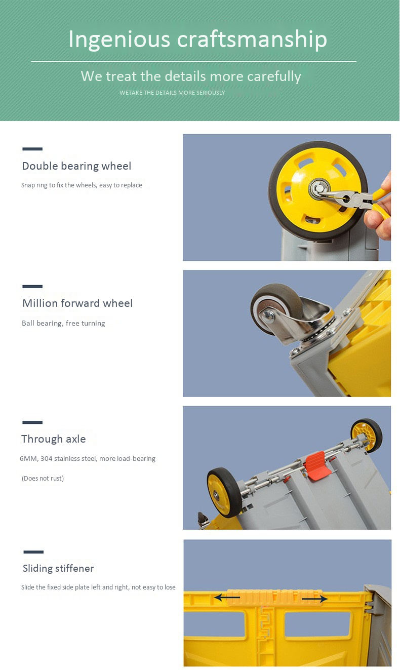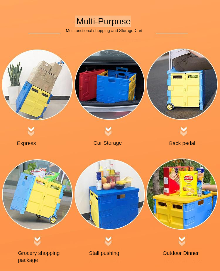Overall design features: novel appearance, stylish and generous, rich colors, unique portability, open multi-function. Plastic material has the advantages of environmental protection, durability, light and thin texture, soft hand feeling, good water resistance, easy cleaning, and non-fading. Simple disassembly and installation procedures, support for weight of 55kg, and large accommodation space are favored by users of shopping malls, travel, and indoor and outdoor goods transmission.