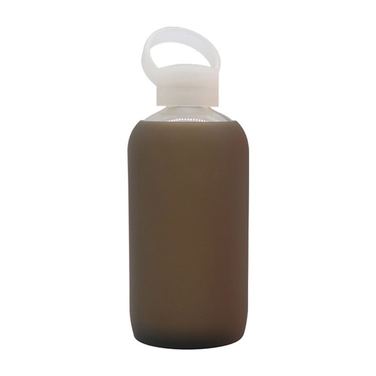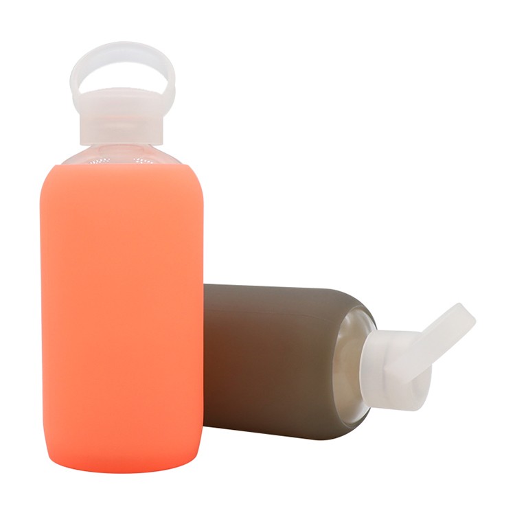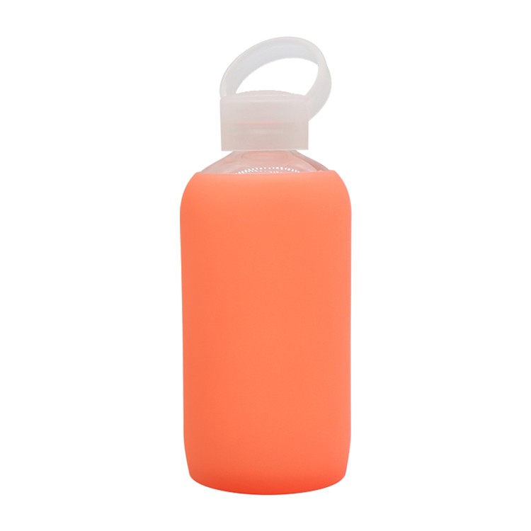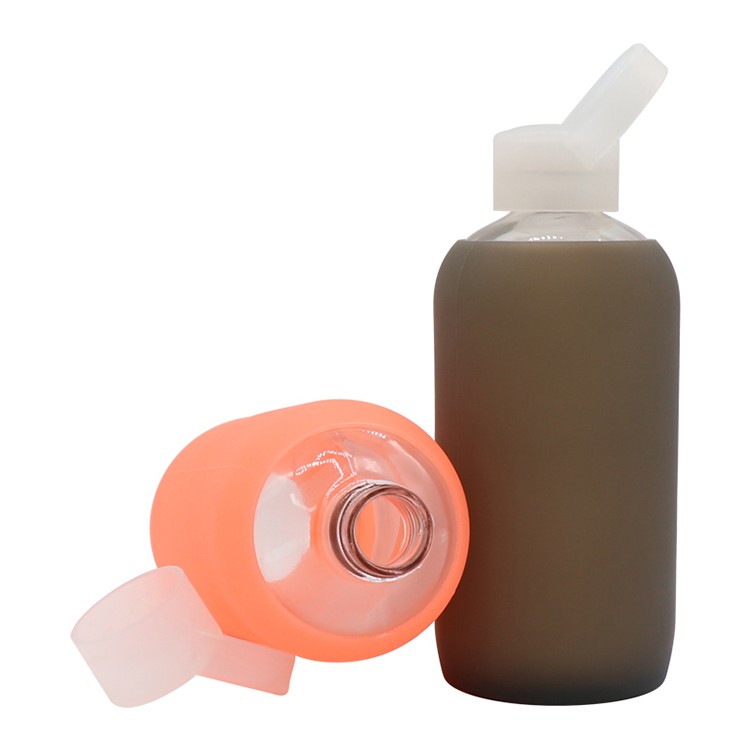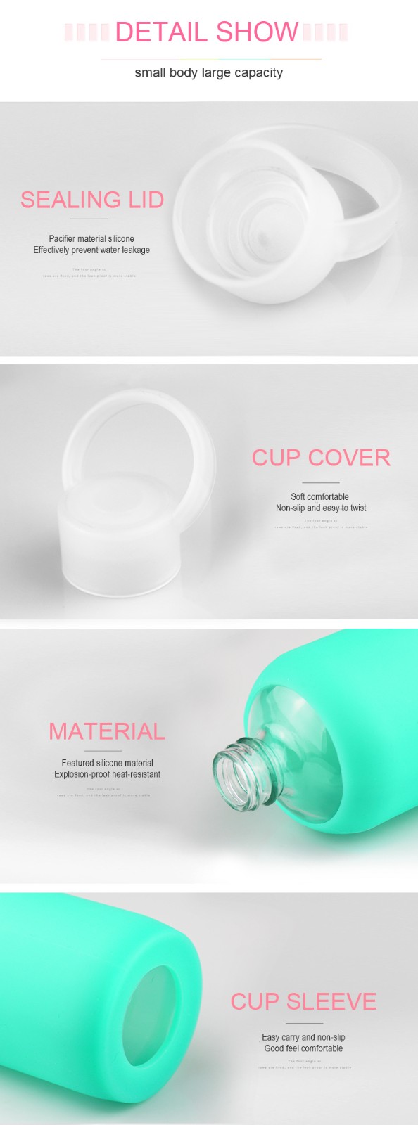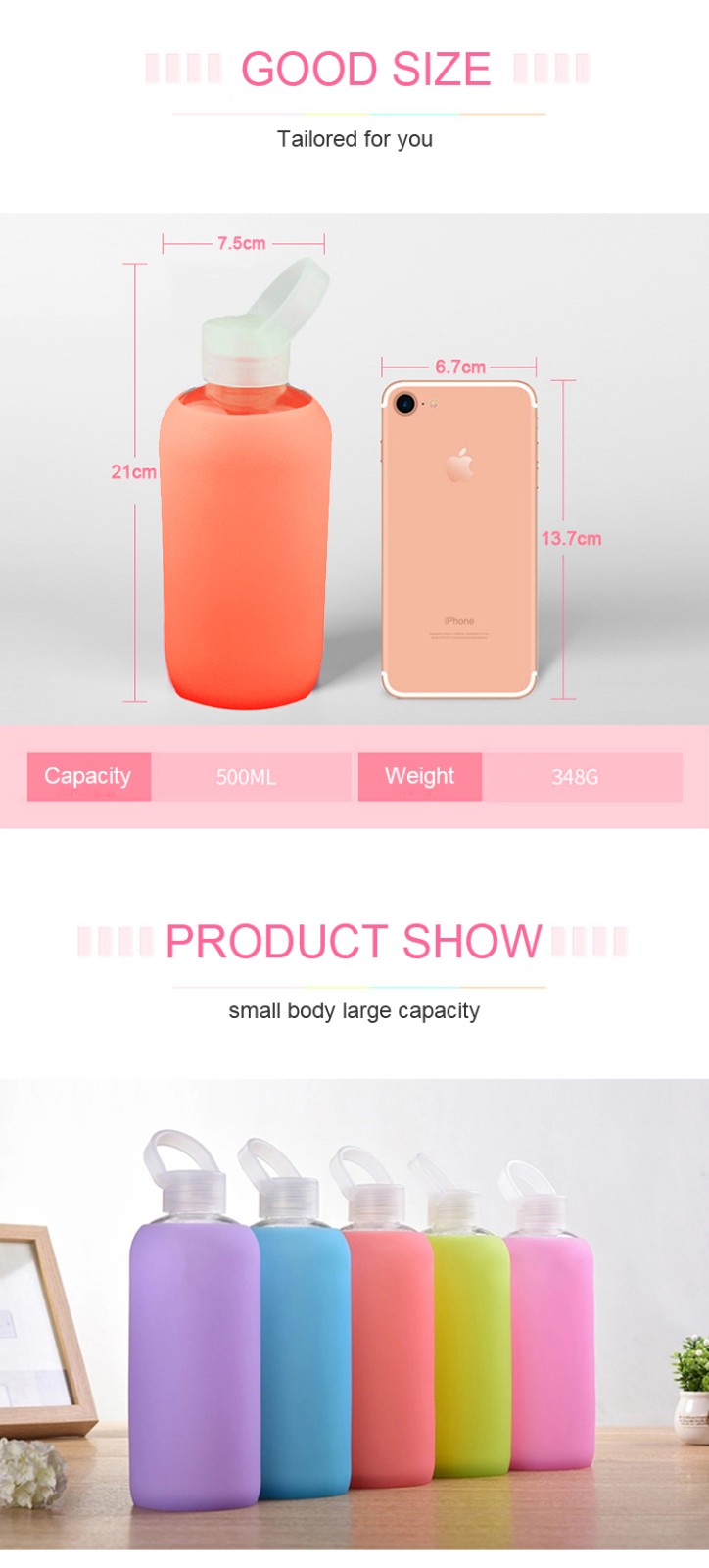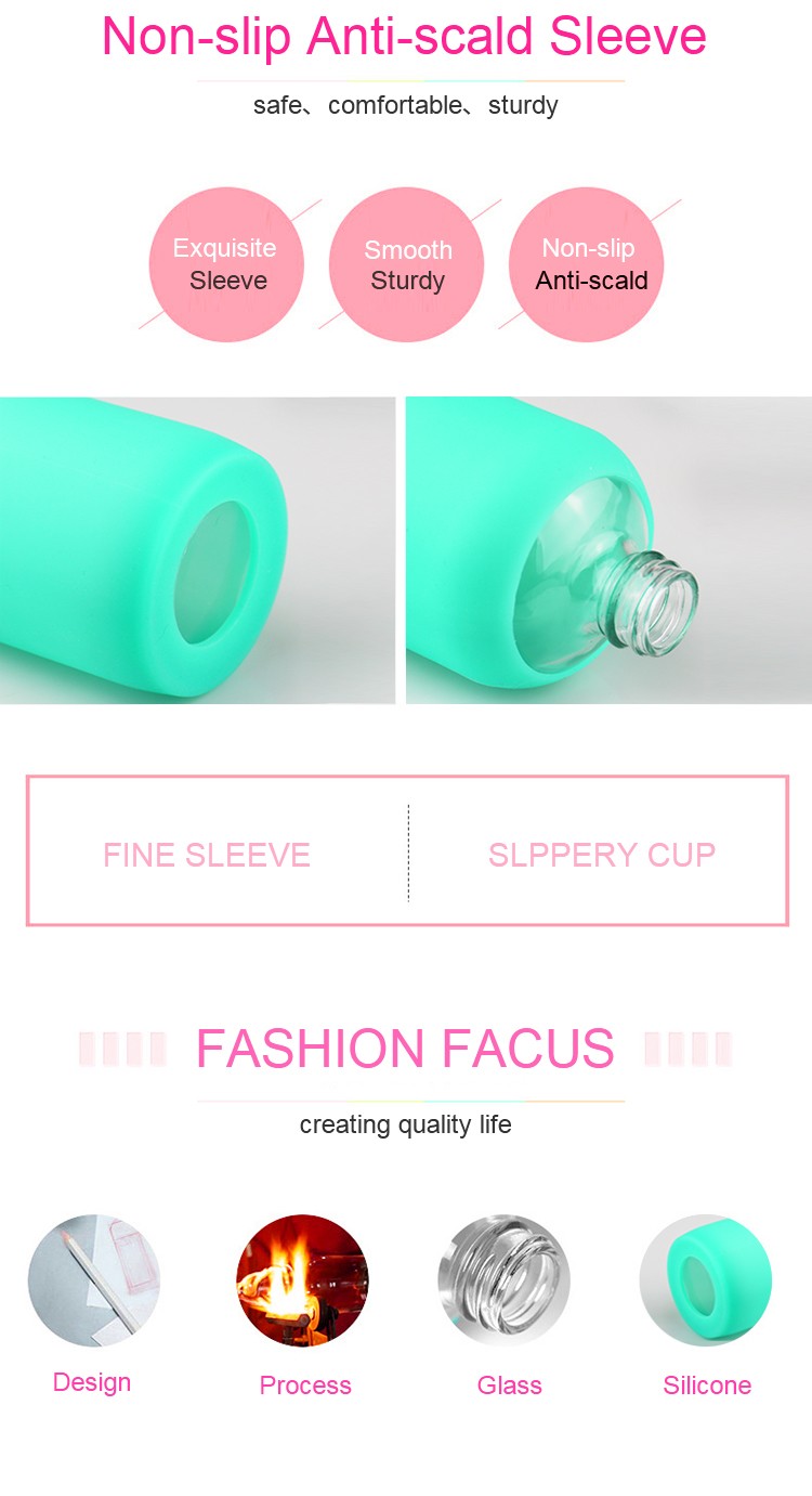 Made of high quality silicone and glass material water bottle, non-stick, eco-friendly, heat- resistant, beautiful design, big capacity and easy to carry, multi colors in stock optional, OEM/ODM are welcome, custom color and print logo are available